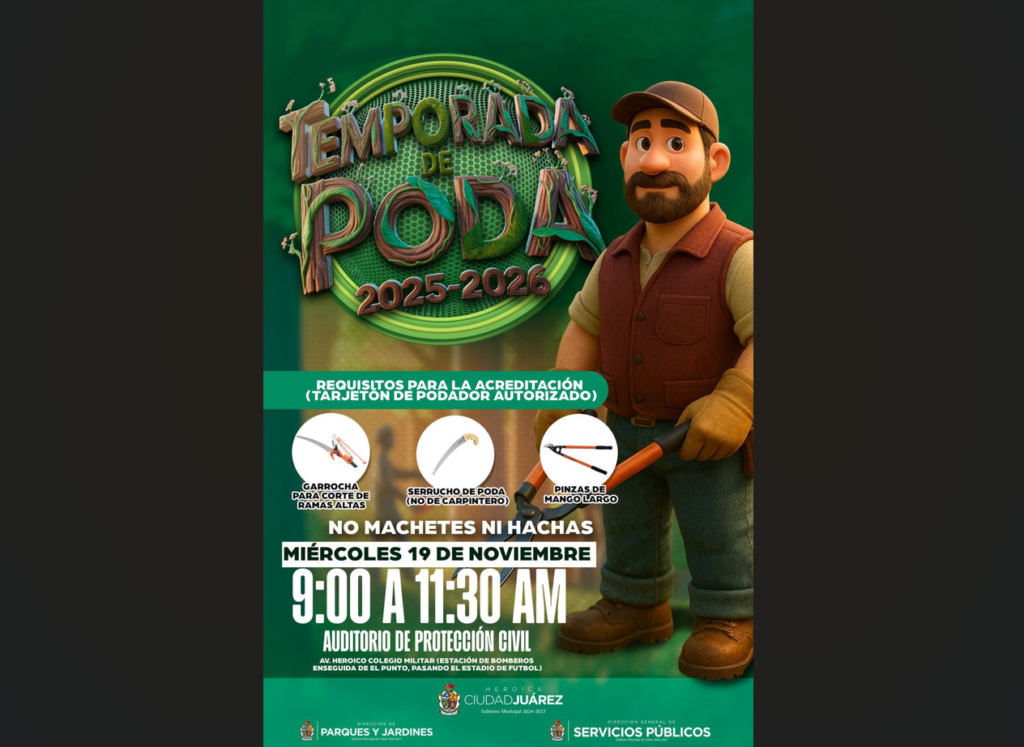 CD. JUAREZ, CHIH.- La Dirección de Parques y Jardines del Municipio invita a la ciudadanía al taller de poda correspondiente a la Temporada de Poda 2025–2026, que se llevará a cabo el próximo miércoles 19 de este mes, de 9:00 a 11:30 de la mañana, en el auditorio de Protección Civil, ubicado sobre la avenida Heroico Colegio Militar, junto a la Estación de Bomberos y el estadio de futbol.