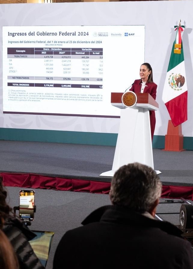Detalló que, el total de ingresos al 23 de diciembre de 2024 es de 5.4 billones de pesos, en relación al 2023 hay un crecimiento de 316 mdp.