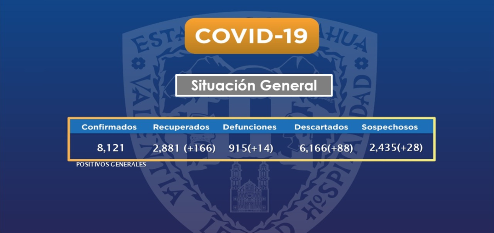 CHIHUAHUA, CHIH.- La Secretaría de Salud Chihuahua informó que el número de casos confirmados de COVID-19 en el estado subió a 8 mil 121, luego de ingresarse 125 nuevos positivos, mientras que otras 14 personas fallecieron por esta enfermedad, y la cifra total es de 915 para la entidad.