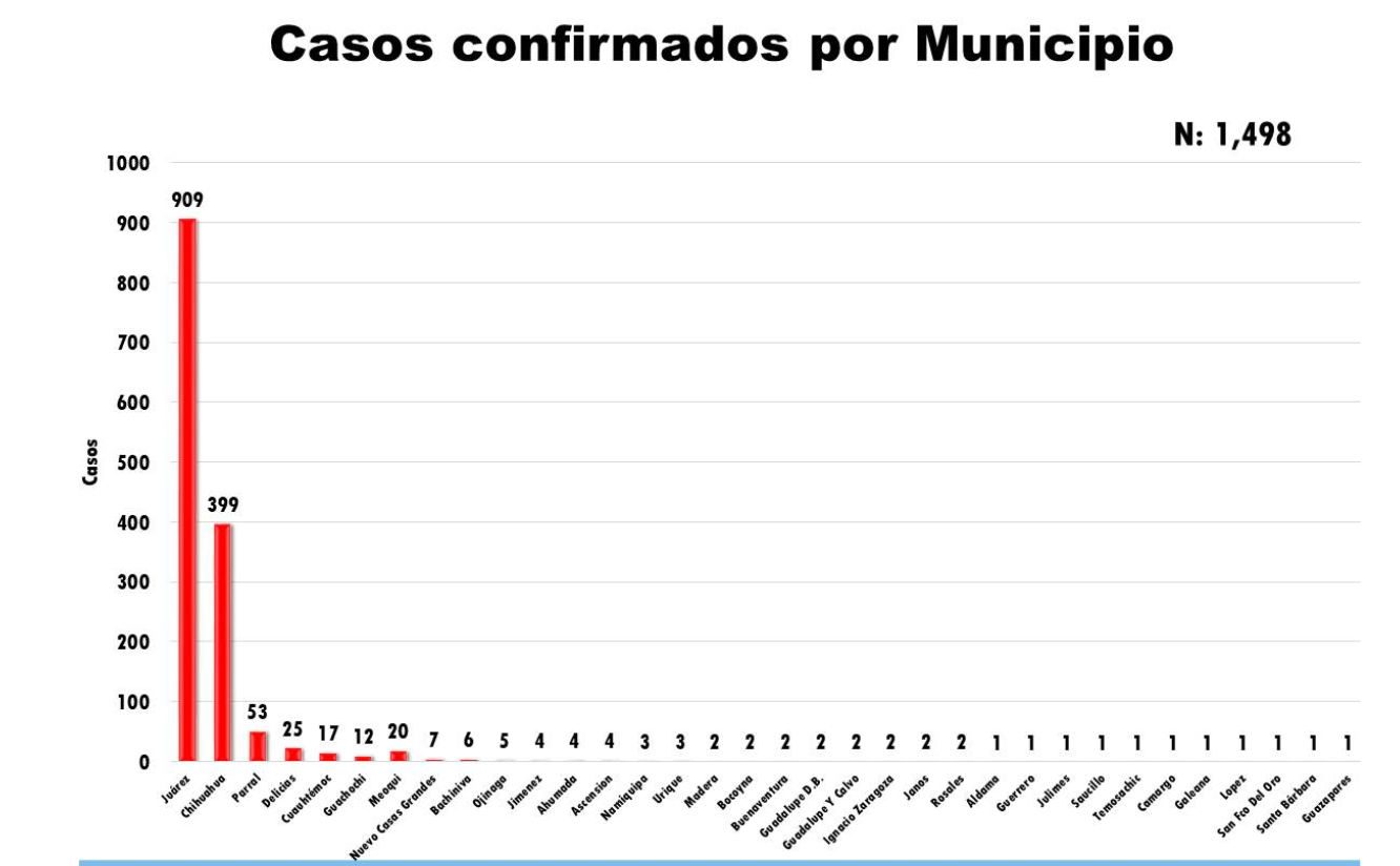 De acuerdo a la información epidemiológica, de los 1,498 confirmados, 909 son en Juárez, 399 a la ciudad de Chihuahua, 6 a Bachíniva, 17 a Cuauhtémoc, 5 a Ojinaga, 3 a Namiquipa, 20 a Meoqui, 1 a Julimes, 1 a Camargo, 1 a Saucillo, 4 de Ahumada, 2 a Guadalupe D.B., 12 a Guachochi, 25 a Delicias, 4 de Ascensión, 1 a Guerrero, 2 a Bocoyna, 2 a Madera, 53 a Parral, 2 a Buenaventura, 1 a Temósachi, 1 a Galeana, 2 a Guadalupe y Calvo, 7 a Nuevo Casas Grandes, 2 a Rosales, 4 a Jiménez, 1 de Aldama, 1 a Santa Bárbara, 2 a Ignacio Zaragoza, 1 a López, 3 a Urique, 2 a Janos, 1 a San Francisco del Oro y 1 a Guazapares.