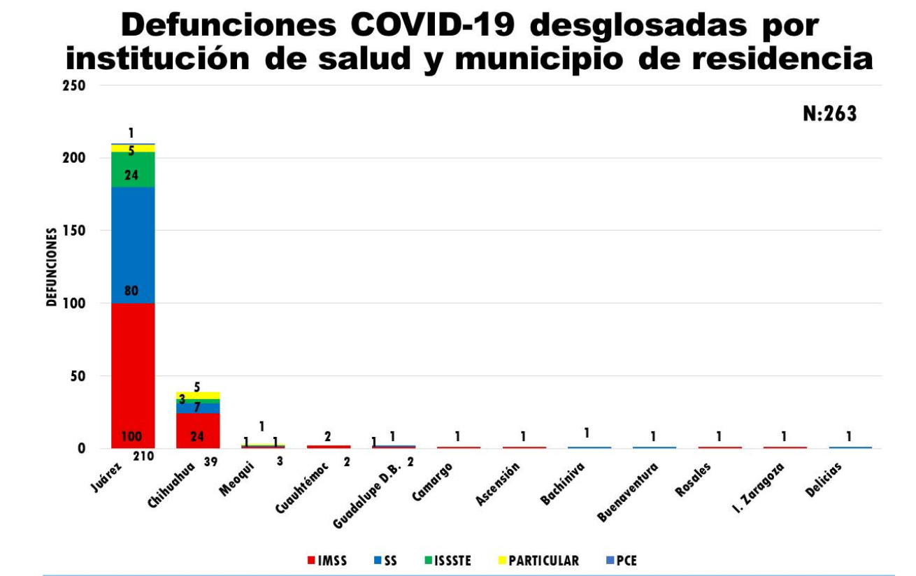 Desglose de defunciones por municipio e institución médica: Juárez: 100 IMSS, 80 Sector Salud, 24 Issste, 5 particular, 1 PCE; Chihuahua: 24 IMSS, 7 Sector Salud, 3 Issste, 5 particular; Cuauhtémoc: 2 IMSS; Guadalupe: 1 IMSS, 1 Sector Salud; Ascensión: 1 IMSS; Camargo: 1 IMSS; Rosales: 1 IMSS; Bachiniva: 1 Sector Salud; Meoqui : 1 IMSS, 1 Sector Salud, 1 particular; Buenaventura: 1 PCE; Delicias: 1 Sector Salud e Ignacio Zaragoza: 1 Sector Salud.