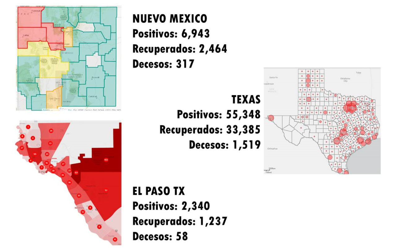En Nuevo México: 6,943 confirmados, 2,464 recuperados y 317 decesos; Texas: 55,348 confirmados, 1,519 decesos y 33,385 recuperados; El Paso: 2,340 positivos, 58 fallecimientos y 1,237 pacientes recuperados.