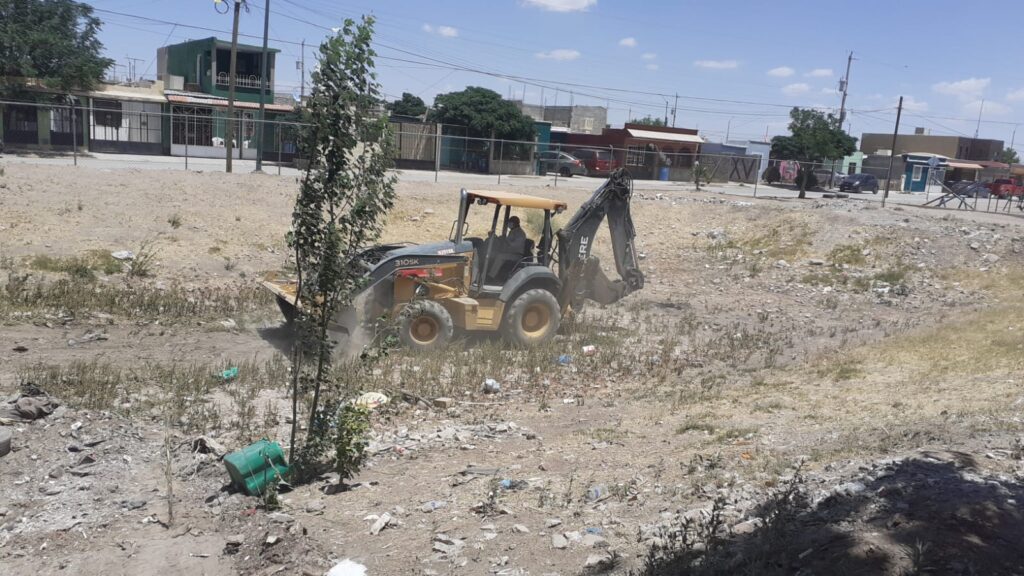 CD. JUAREZ, CHIH.- Como parte de la estrategia Cruzando Riberas que implementa el Gobierno Municipal, personal de la Dirección General de Obras Públicas interviene las etapas 4 y 6 de Riberas del Bravo a través de acciones enfocadas en la limpieza de vasos de captación y bacheo de vialidades.