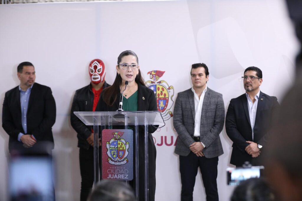 En la presentación del evento estuvieron Francisco Rodríguez, director administrativo de Desarrollo Urbano; Rodrigo Fuentes, coordinador de Proyectos y el luchador profesional juarense “Ráfaga”.