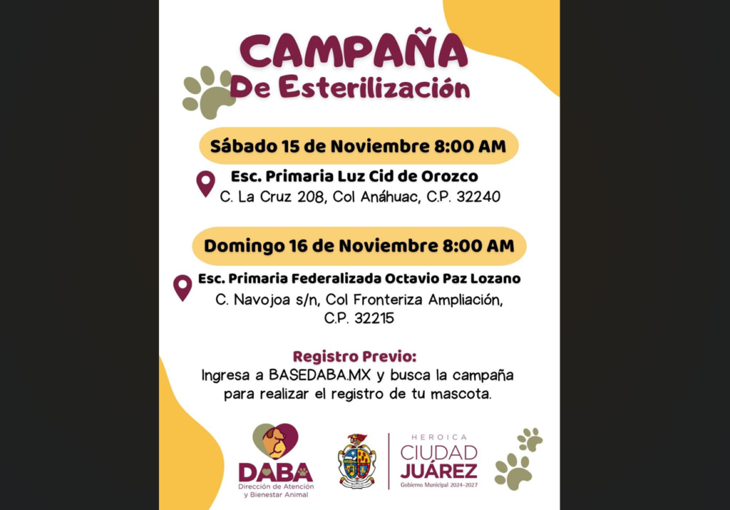 CD. JUAREZ, CHIH.- La Dirección de Atención y Bienestar Animal (DABA), invita a la ciudadanía a registrarse para que sus mascotas sean esterilizadas el próximo fin de semana, a través de la campaña gratuita que se efectuará esos días.