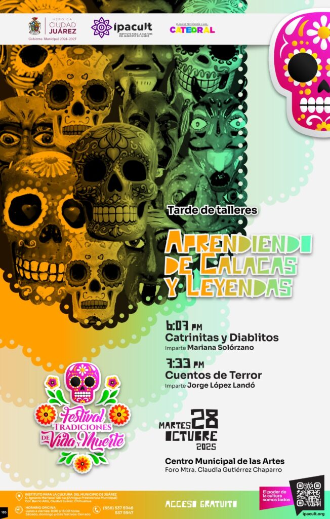 CD. JUAREZ, CHIH.- Como parte de las actividades del Festival de Tradiciones de Vida y Muerte, el Instituto para la Cultura del Municipio de Juárez (IPACULT) invita a la ciudadanía a participar de manera gratuita en los talleres “Aprendiendo de calacas y leyendas”, que se llevarán a cabo el martes 28 de octubre en el Centro Municipal de las Artes (CMA).