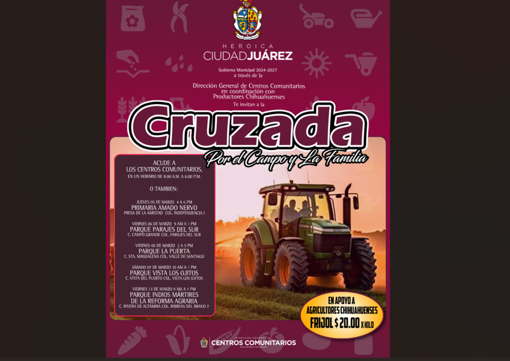 CD. JUAREZ, CHIH.- El Gobierno Municipal, a través de la Dirección General de Centros Comunitarios y en coordinación con productores del campo chihuahuense, invita a la ciudadanía a participar en la Cruzada por el Campo y la Familia, un programa que acercará brigadas médicas y la venta de frijol a precio accesible en distintos sectores de la ciudad.
