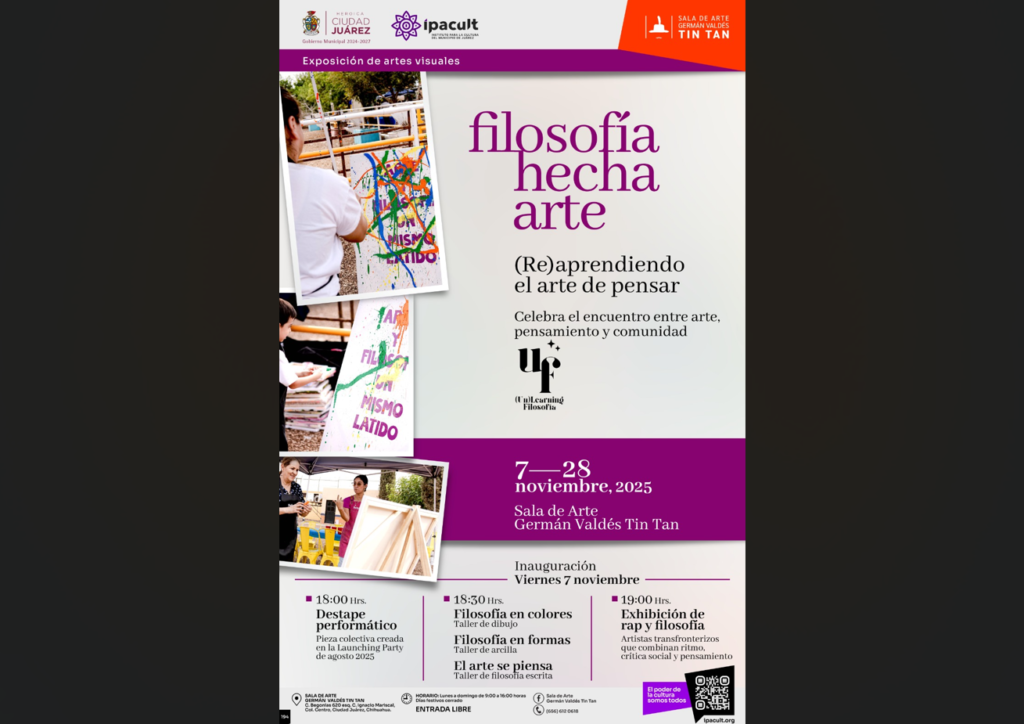 CD. JUAREZ, CHIH.- El arte y la filosofía se dan la mano en una nueva propuesta cultural del Instituto para la Cultura del Municipio de Juárez (IPACULT), que invita a la ciudadanía a la inauguración de la exposición “Filosofía hecha arte, (Re)aprendiendo el arte del pensar”, este jueves 7 de noviembre a las 6:00 de la tarde en la Sala de Arte Germán Valdés Tin Tan.