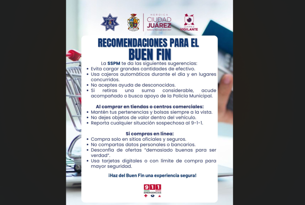 CD. JUAREZ, CHIH.-Con motivo del programa comercial el Buen Fin, la Secretaría de Seguridad Pública Municipal informa que hará un operativo especial de vigilancia y prevención del delito, con el objetivo de brindar seguridad a la ciudadanía durante este periodo de alta actividad comercial y movimiento económico.