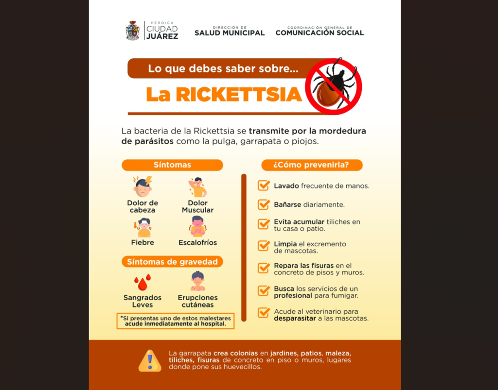 CD. JUAREZ, CHIH.- La Dirección de Salud Municipal hizo un llamado a la ciudadanía para informarse sobre la rickettsia, con el objetivo de prevenir contagios y proteger la salud de las familias juarenses de esta enfermedad que es transmitida por la mordedura de parásitos como pulgas, garrapatas o piojos.