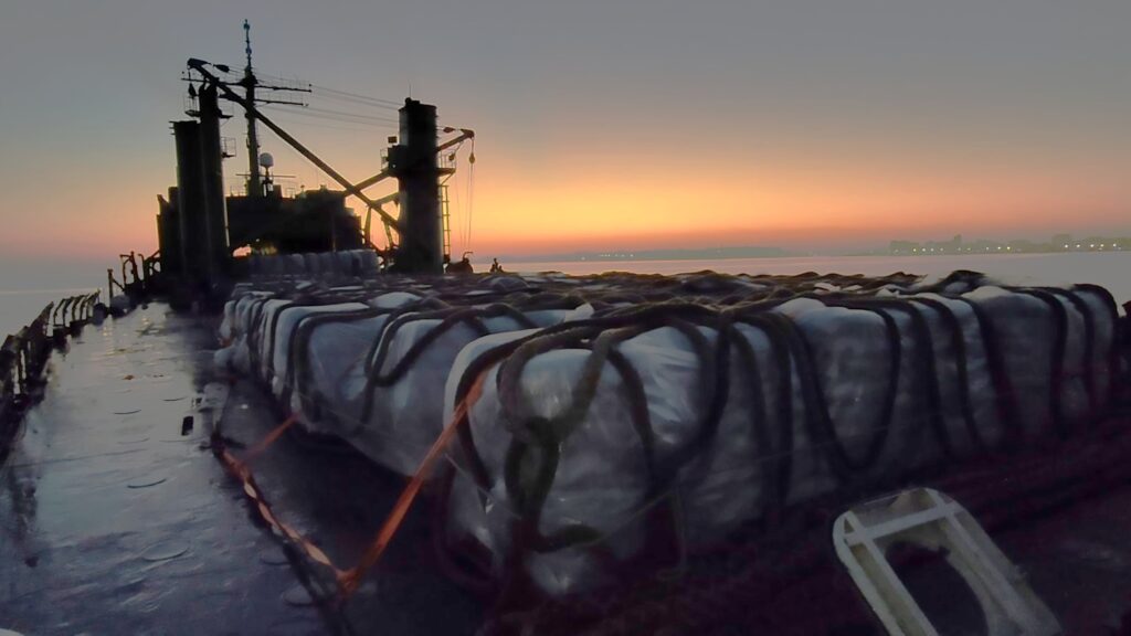 Para el traslado vía marítima, embarque y desembarque de la carga se emplean más de 350 elementos navales, una grúa y cinco montacargas.