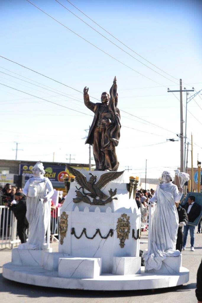 Esta parte inicio con un carro alegórico que refleja el espíritu indómito de las y los fronterizos, por ello se eligió el Monumento de Los Indomables.