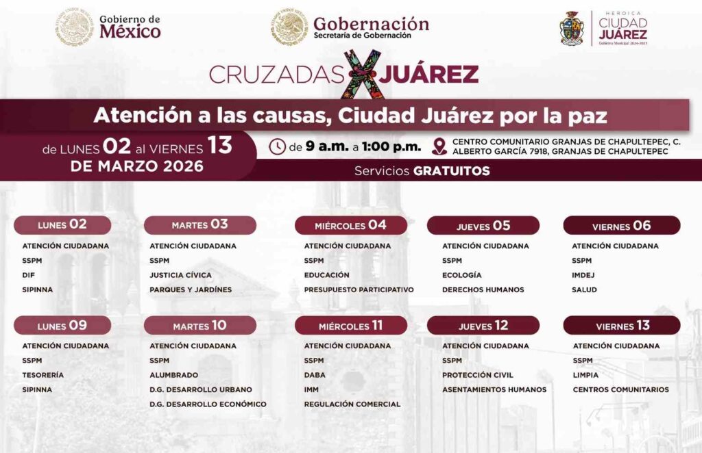 CD. JUAREZ, CHIH.- El próximo sábado 14 de marzo se llevará a cabo el programa Cruzadas por Juárez, Atención a las Causas, Ciudad Juárez por la Paz en la colonia Revolución Mexicana, en la calle General Julio Acosta y calle General Calixto Contreras de 9:30 de la mañana a 1:30 de la tarde.