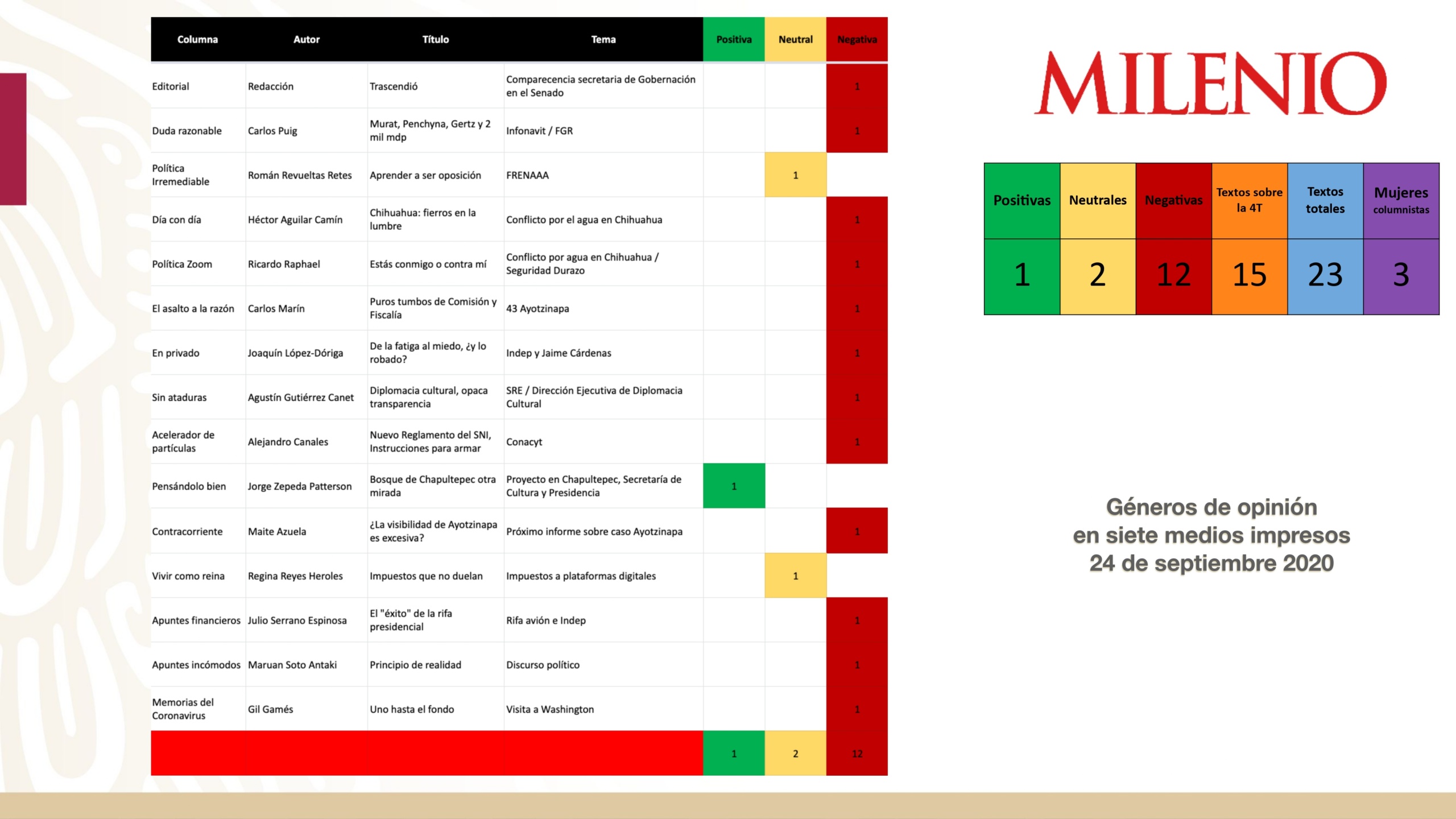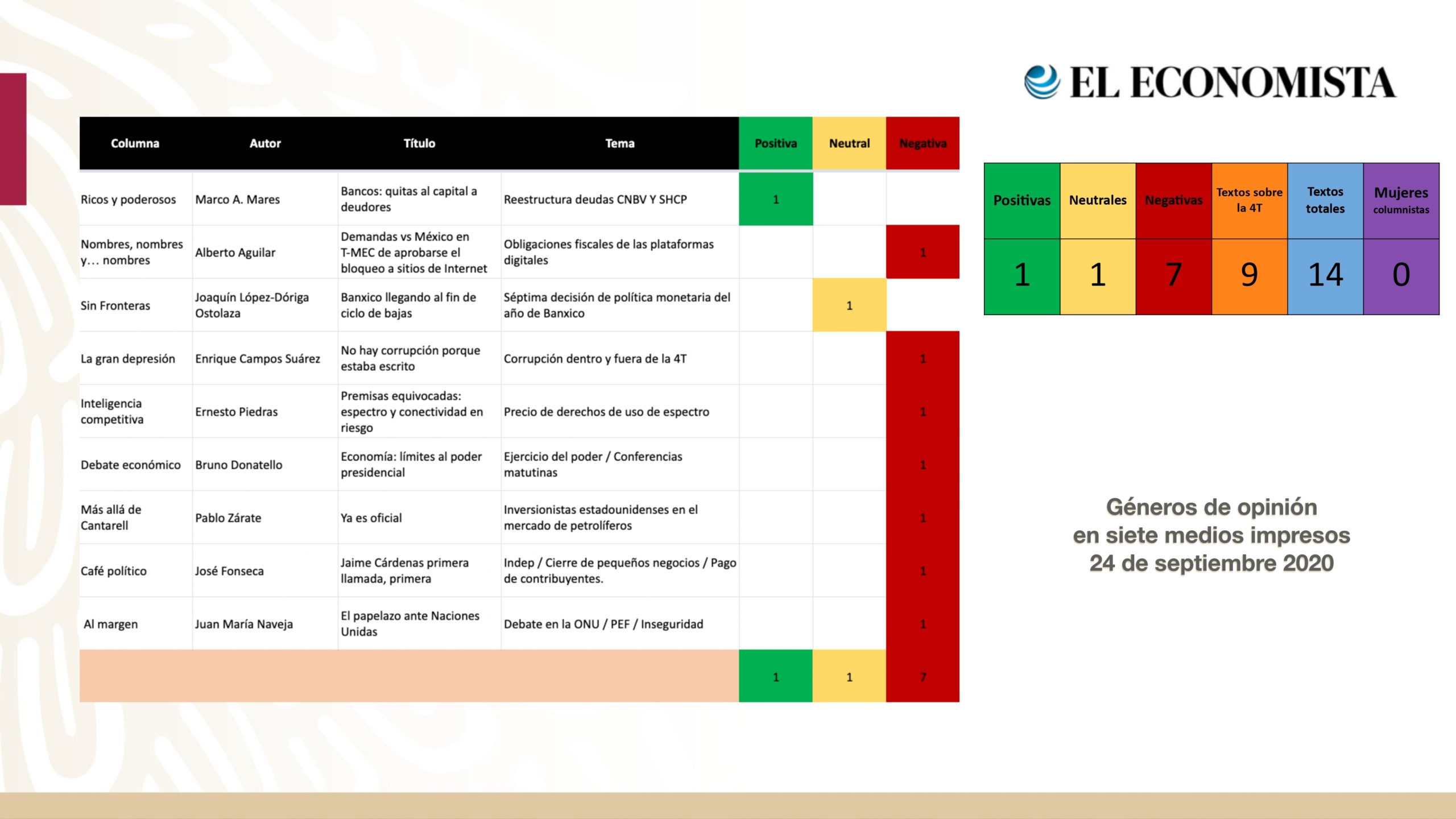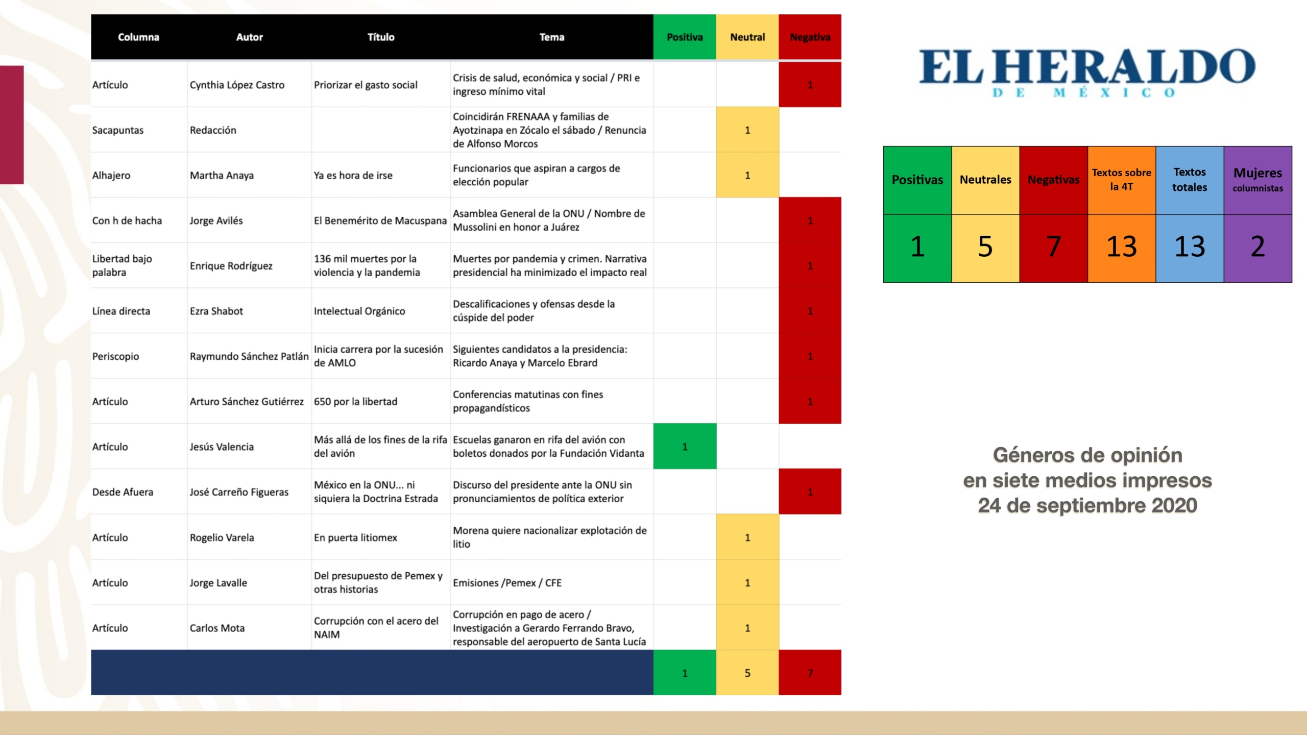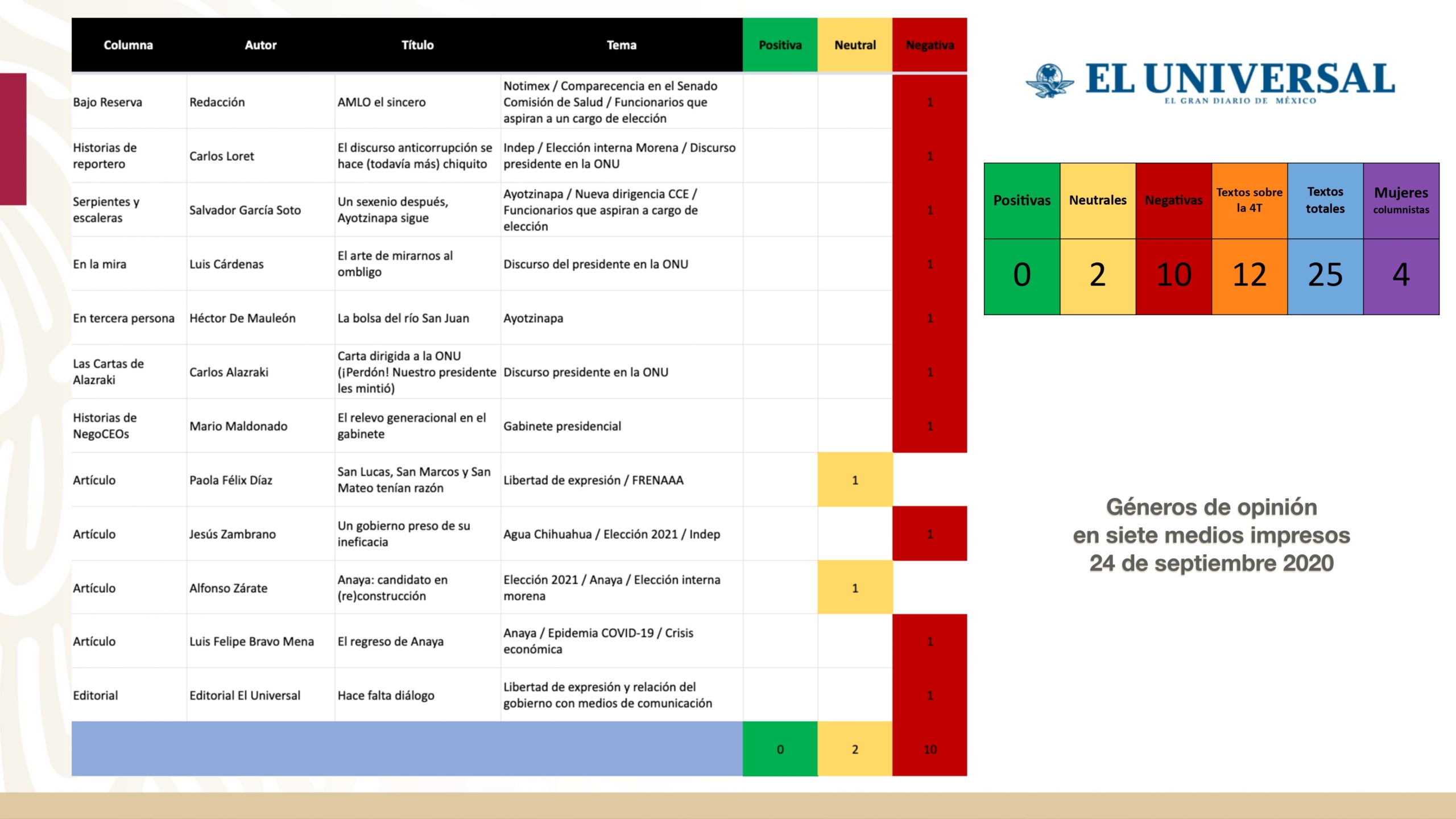 CIUDAD DE MEXICO.- El presidente Andrés Manuel López Obrador reafirmó su compromiso de respetar la libertad de expresión. En conferencia de prensa, presentó un análisis de 148 artículos de opinión en siete medios impresos del 24 de septiembre.