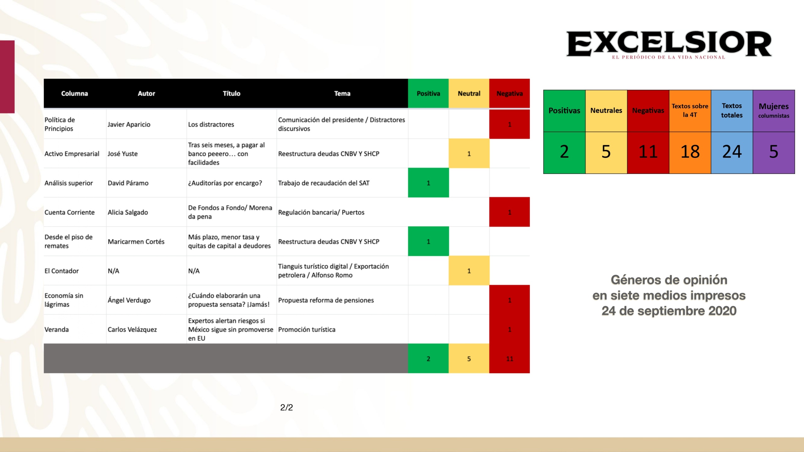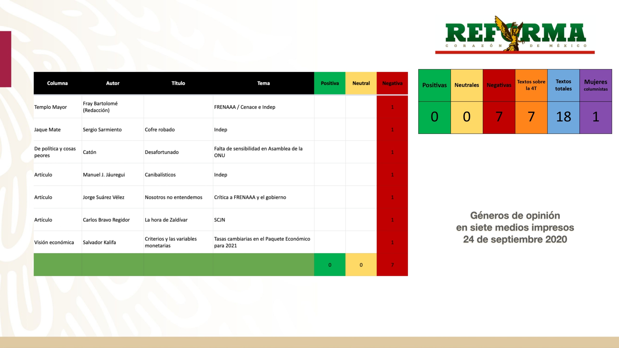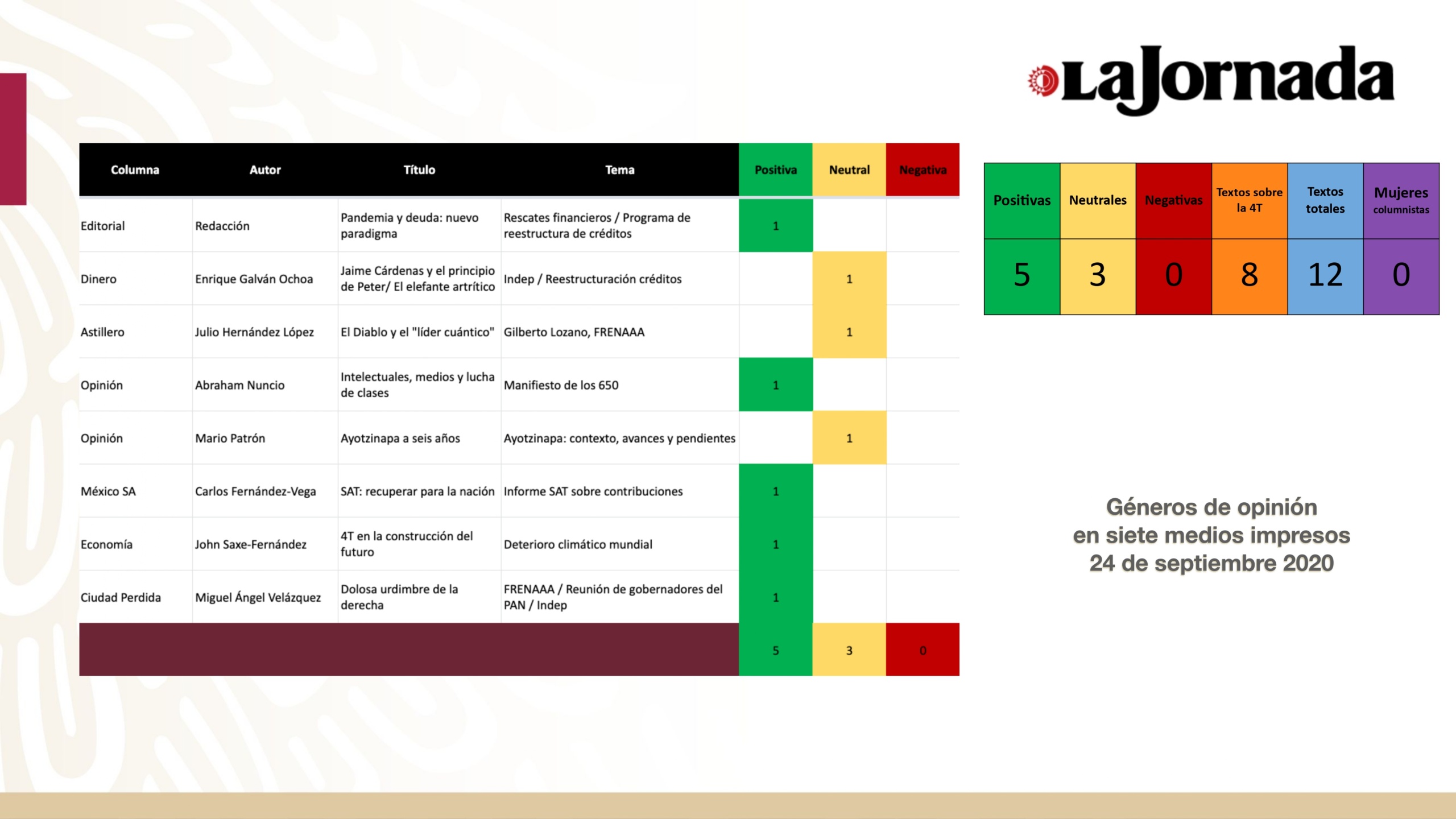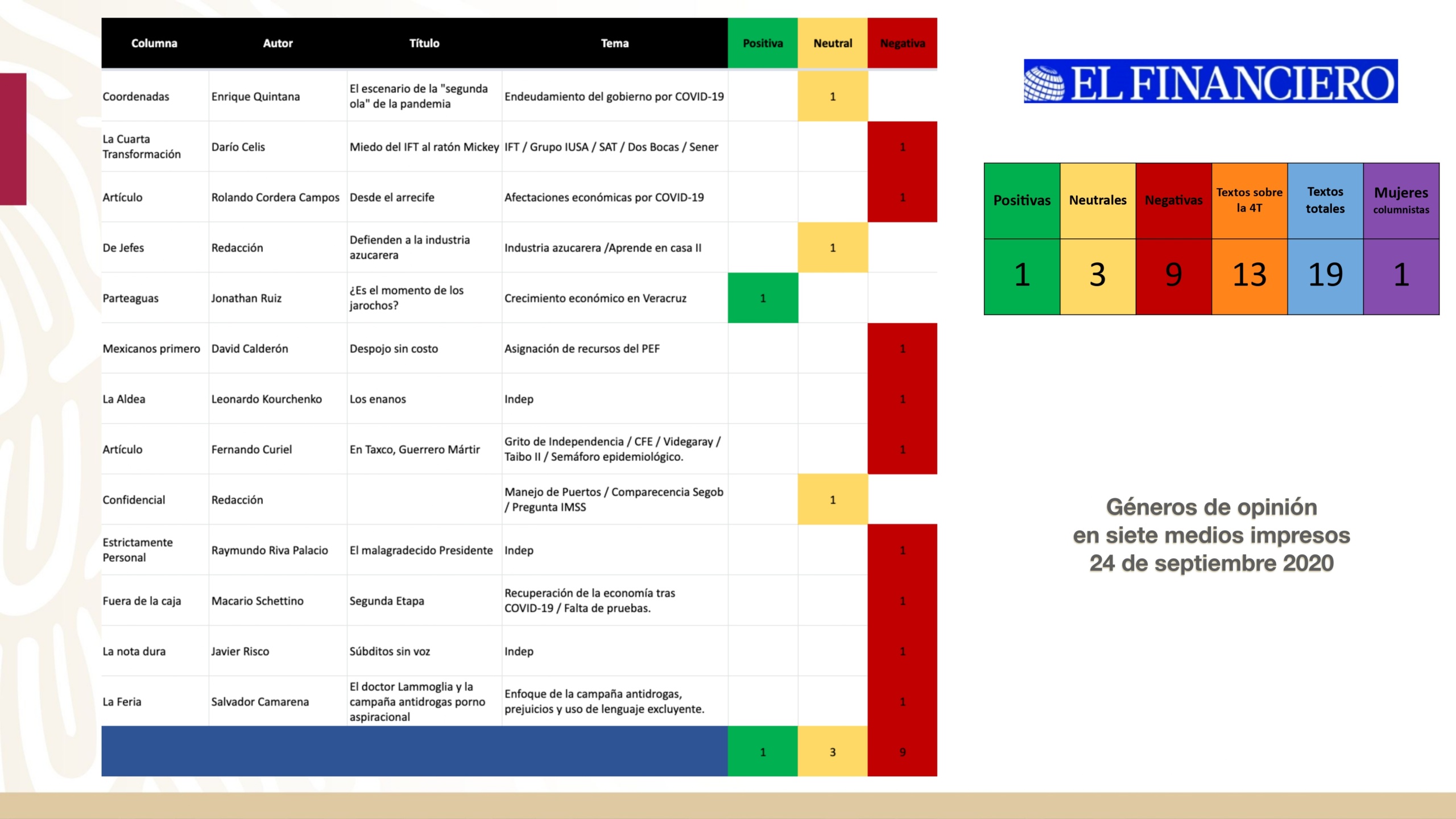 CIUDAD DE MEXICO.- El presidente Andrés Manuel López Obrador reafirmó su compromiso de respetar la libertad de expresión. En conferencia de prensa, presentó un análisis de 148 artículos de opinión en siete medios impresos del 24 de septiembre.