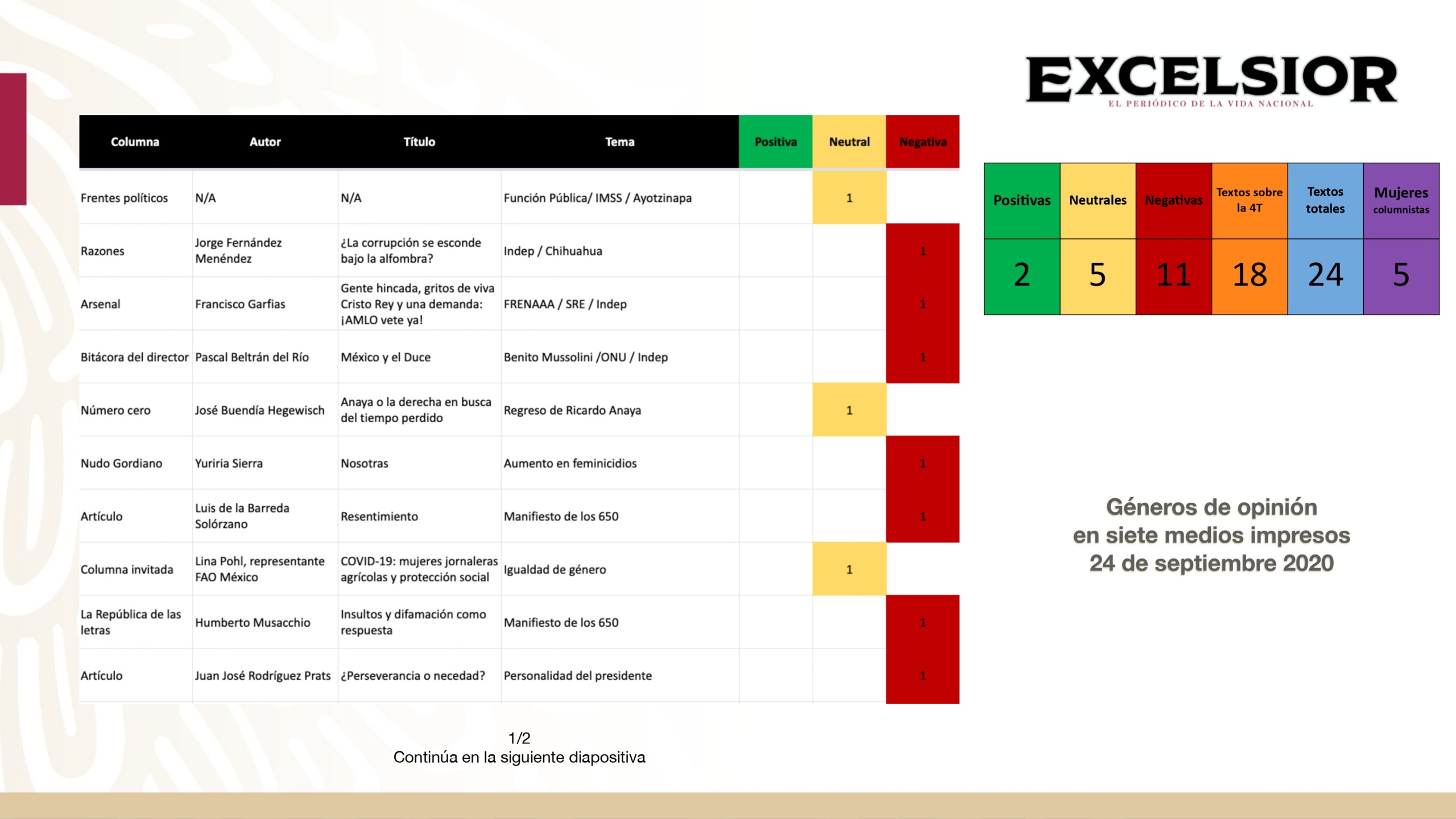 El jefe del Ejecutivo resaltó que del total de los textos revisados, solo 16 mujeres eran las autoras, lo que corresponde al 10.81% de los columnistas.