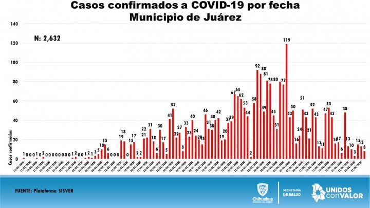 Juárez permanece a la cabeza de contagios con 2,632 y 506 defunciones, seguido de Chihuahua con 1,145 y 89 decesos.