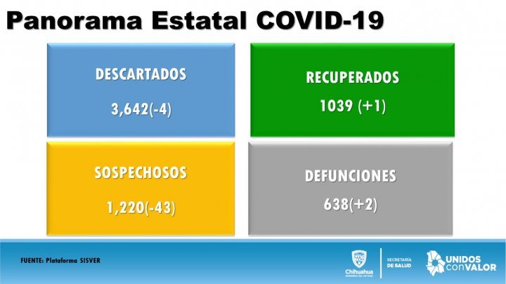 CHIHUAHUA, CHIH.- La Secretaría de Salud informó que de acuerdo al informe epidemiológico correspondiente a las 19:00 horas del 28 de junio, hay en el estado de Chihuahua un total general de 4,443 casos confirmados de COVID-19, así como 638 personas fallecidas.