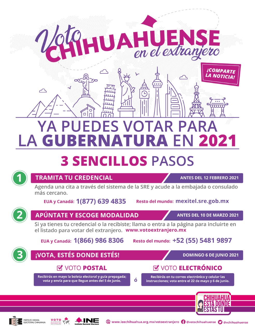 En las elecciones del 2021 será la primera vez cuando las y los chihuahuenses podrán votar por la Gubernatura del Estado; el requisito indispensable para poder ejercer el voto es contar con la credencial de elector vigente y este trámite se puede realizar en los consulados de manera gratuita.