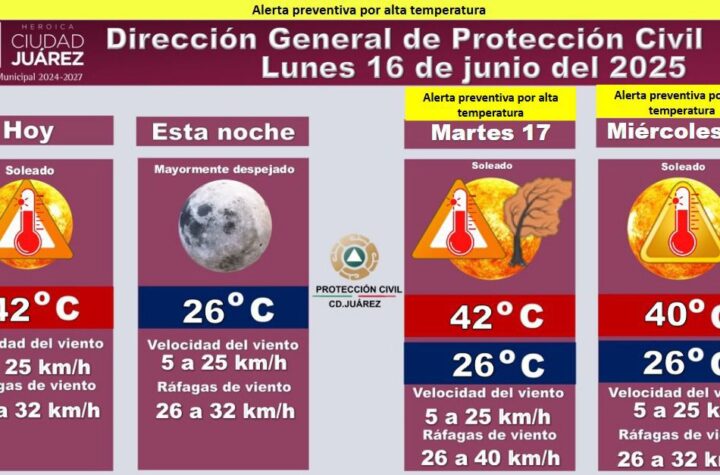 LUNES 16 JUNIO 2025 POR REDACCION CD. JUAREZ, CHIH.- La Dirección General de Protección Civil emitió una alerta preventiva por...