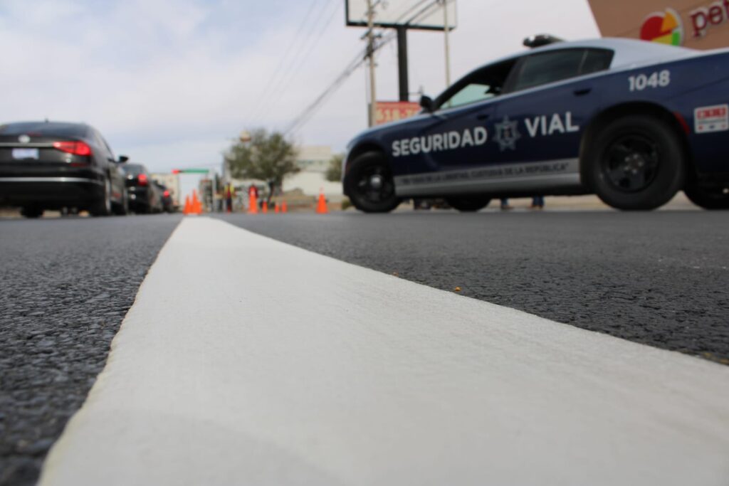 Asimismo, pero en otro sector de la ciudad, se pintaron líneas con pintura amarilla en el eje central de los carriles sobre la calle Valle del Sol, en el tramo que va del bulevar Francisco Villarreal Torres hasta la calle Tres Cantos.