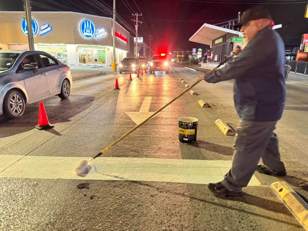 También se hicieron trabajos de pintura sobre el bulevar Zaragoza, esquina con calle Durango, en la colonia Salvárcar, donde se pintaron líneas de frenado y flechas.