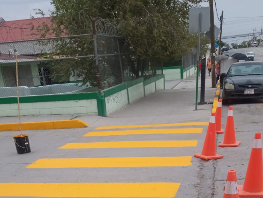 CD. JUAREZ, CHIH.- Con el objetivo de resguardar la integridad física de alumnos, docentes y familiares, personal de la Coordinación General de Seguridad Vial le dio mantenimiento a la pintura de pasos peatonales y cordones de banqueta en el exterior de las siguientes escuelas: