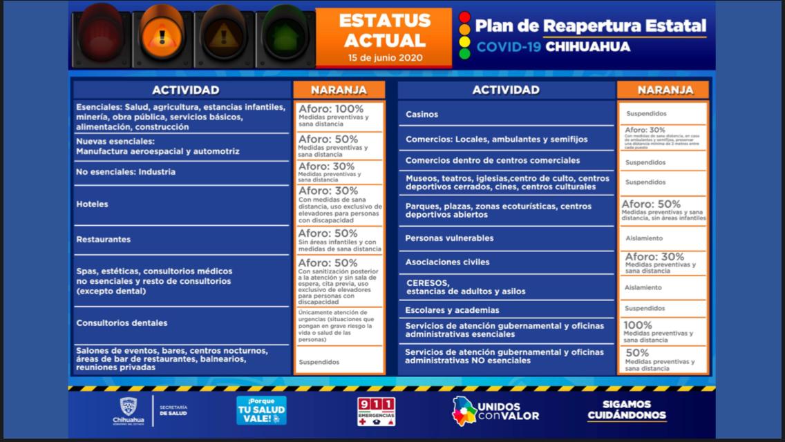 Además permanece la apertura solo de la proporción autorizada en las nuevas actividades esenciales, como son la industria aeroespacial y automotriz, al igual que las restricciones en los servicios de atención gubernamental y los hoteles.