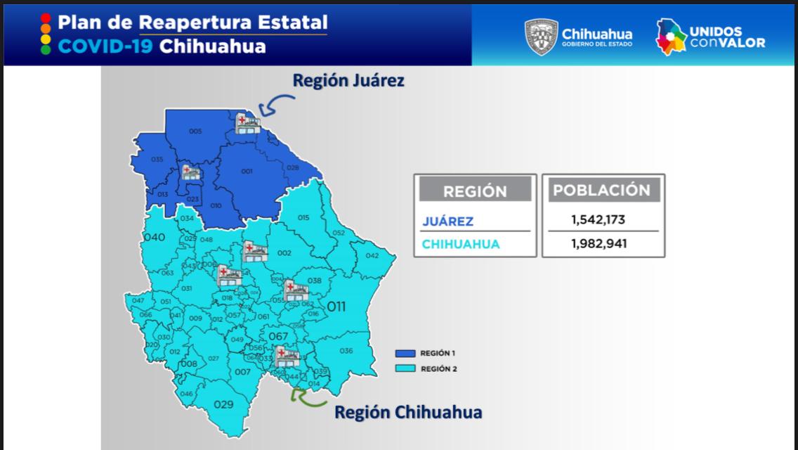 CHIHUAHUA, CHIH.- El sistema de semaforización para la reapertura paulatina y segura de actividades económicas, sociales, deportivas y recreativas en el estado, se aplicará de manera diferenciada en la Región 1, que agrupa a Juárez y otros 9 municipios adjuntos, y en la Región 2, con Chihuahua y 56 municipios más.
