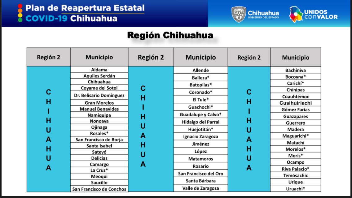 En la denominada Región 1 Juárez, se ubican también los municipios Guadalupe, Ahumada, Ascensión, Buenaventura, Casas Grandes, Nuevo Casas Grandes, Galeana, Janos y Praxedis G. Guerrero, donde la población deberá mantener las medidas preventivas de aislamiento y el cierre de actividades no esenciales.