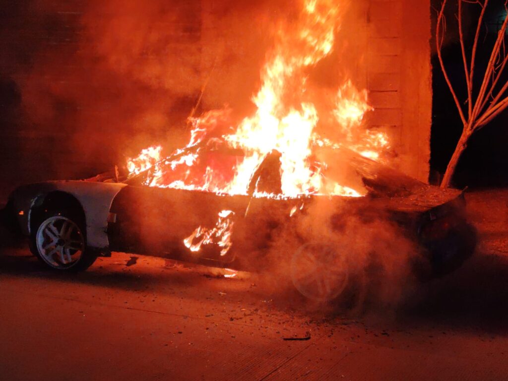 Agentes municipales que realizaban labores de prevención y vigilancia en la colonia Infonavit Juárez Nuevo atendieron un llamado recibido al número de emergencia 911, en el cual se reportaba el incendio de un vehículo de la marca Nissan 240SX, color negro, modelo 1991, en el cruce de las calles Nelumbio y Mandioca.