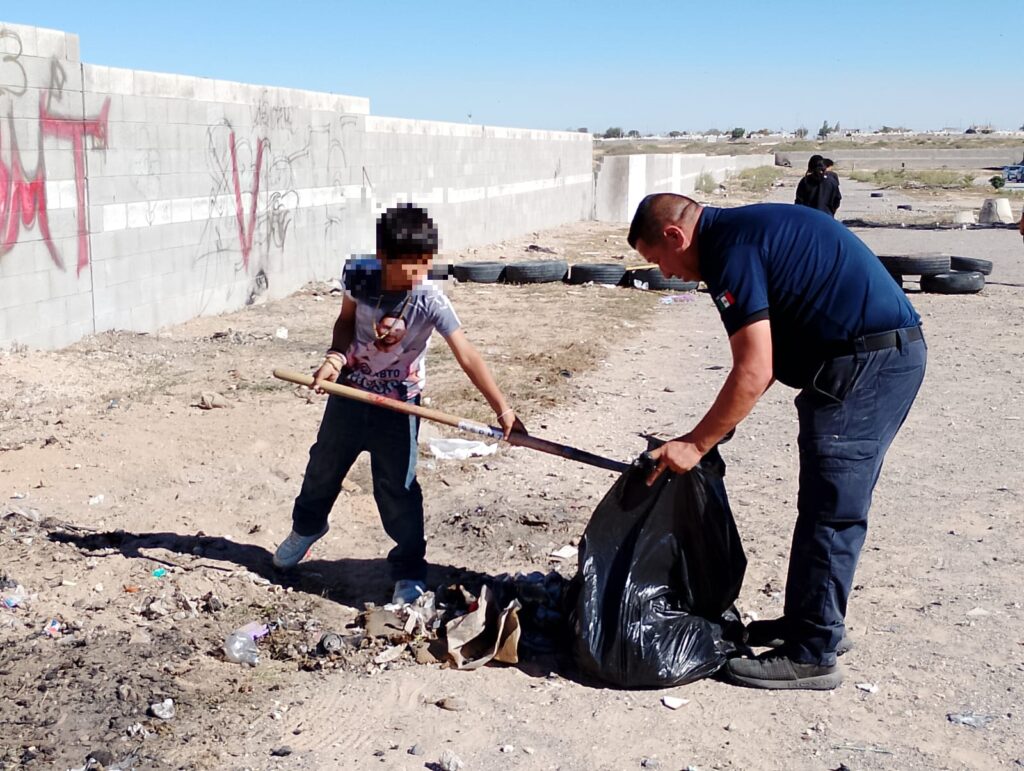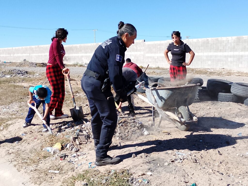 CD. JUAREZ, CHIH.- En una muestra de colaboración comunitaria y compromiso con el bienestar de la juventud, elementos de la Secretaría de Seguridad Pública Municipal, junto con niños, niñas y adolescentes del fraccionamiento Senderos de Oriente, unieron fuerzas para limpiar y habilitar un lote baldío ubicado en el cruce de las calles Senderos de Grava y Senderos del Occidente, con el objetivo de convertir este espacio en una pequeña cancha de fútbol para el disfrute recreativo de los jóvenes de la colonia.