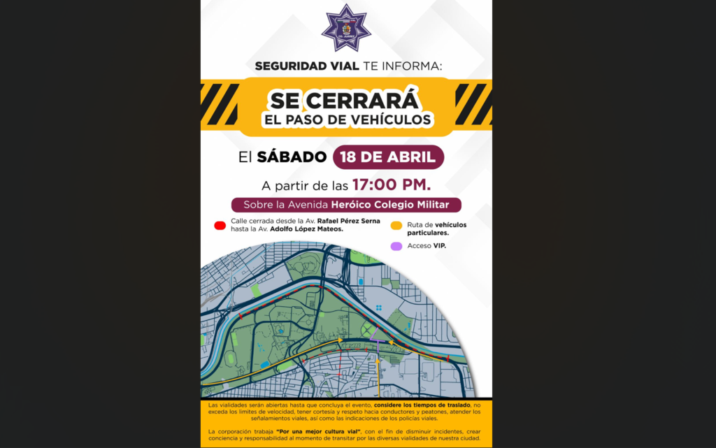 Las vialidades serán abiertas hasta que concluya el evento, por lo que se pide considerar los tiempos de traslado, no exceder los limites de velocidad, tener cortesía y respeto hacia conductores y peatones, atender los señalamientos viales, así como las indicaciones de los policías viales.