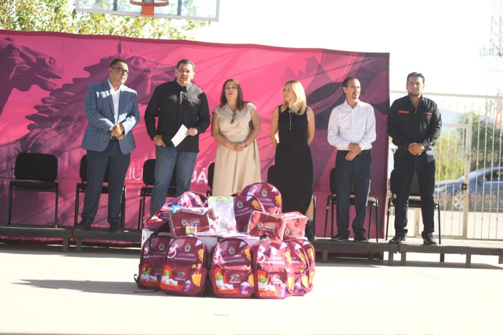 La primera ceremonia se llevó a cabo en la Escuela Primaria Insurgentes, donde niñas y niños recibieron simbólicamente mochilas y loncheras de manos del alcalde.