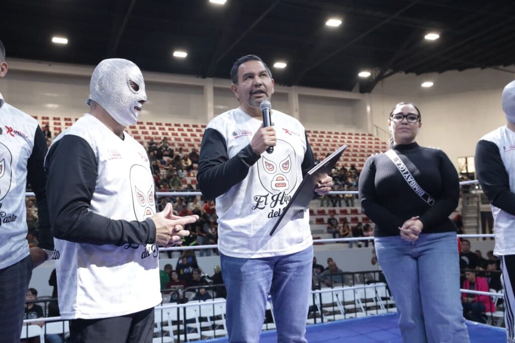 CD. JUAREZ, CHIH.- El Presidente Municipal, Cruz Pérez Cuéllar, junto con miles de juarenses acudieron al remodelado Gimnasio Municipal Josué Neri Santos para acompañar al Hijo del Santo en su gira de despedida de los cuadriláteros.