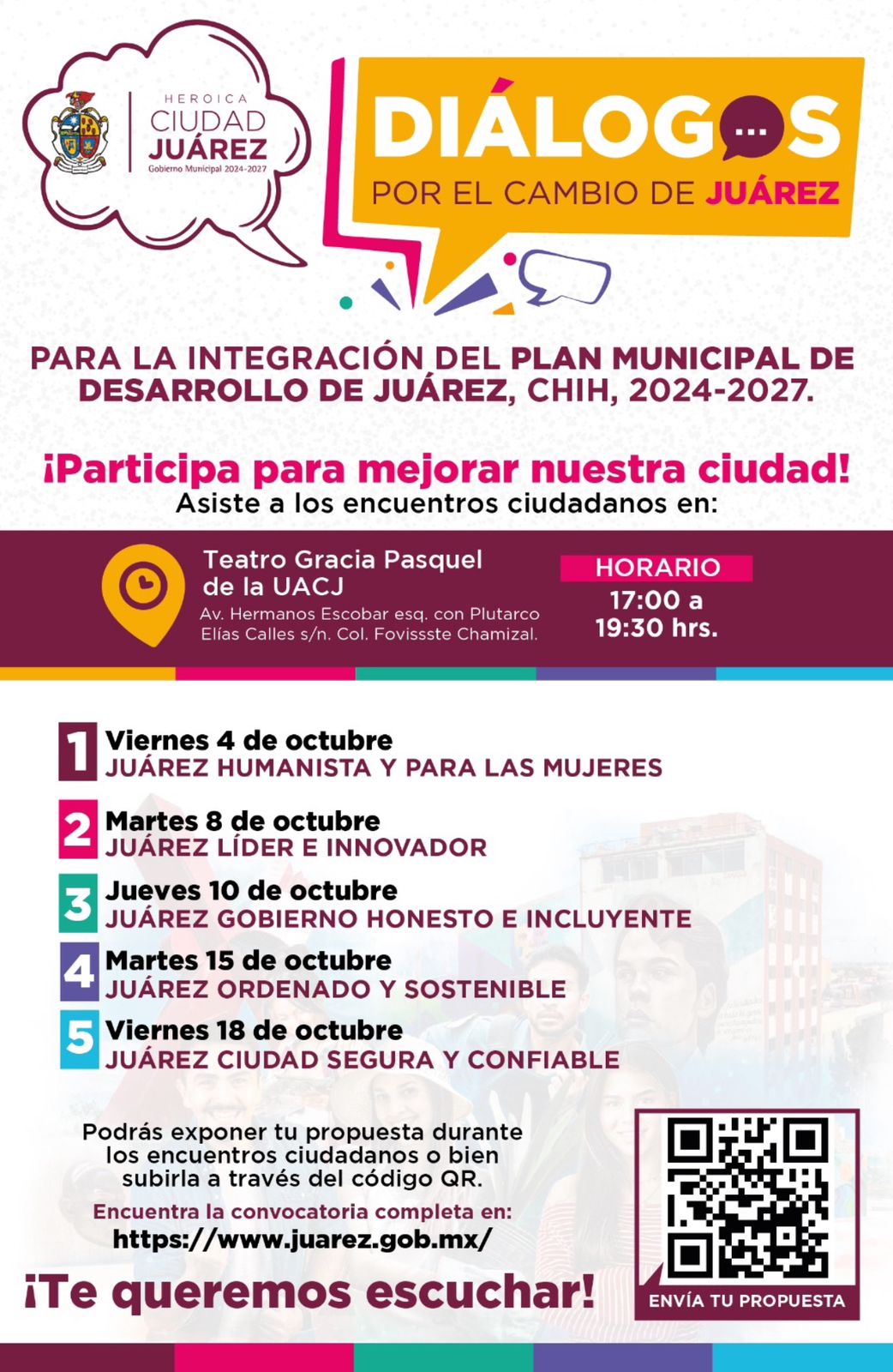 “Es fundamental que la población se involucre y forme parte de la próxima estructura del Plan Municipal de Desarrollo 2024-2027; en tanto, este jueves 26 de septiembre se tendrá una charla informativa con diferentes comités de vecinos, con el propósito de difundir la información relacionada con los «Diálogos por el cambio de Juárez», dijo Vallejo Quintana.