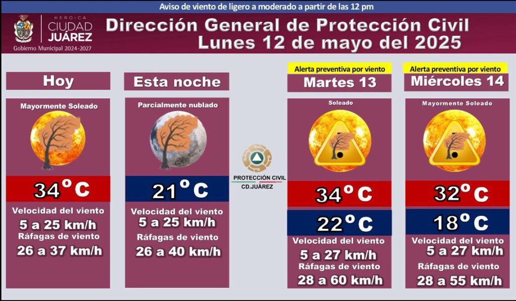 CD. JUAREZ, CHIH.– La Dirección General de Protección Civil emitió el pronóstico del clima para este lunes 12, destacando condiciones mayormente soleadas durante el día, con una temperatura máxima de 34 °C.