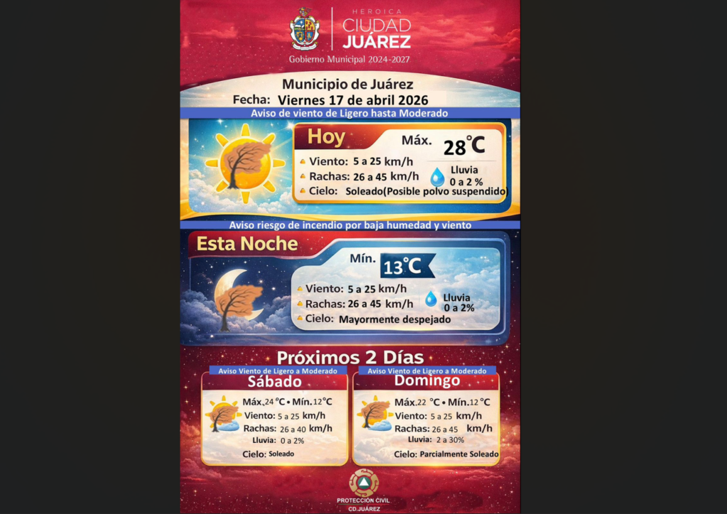 CD. JUAREZ, CHIH.- La Dirección General de Protección Civil emitió el pronóstico meteorológico para este viernes 17 de abril, en el que se advierten condiciones de viento de ligero a moderado, así como riesgo de incendios debido a la baja humedad en la región.