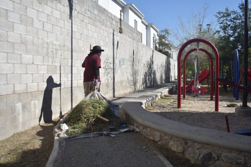 CD. JUAREZ, CHIH.- Como parte de los trabajos permanentes de la Dirección de Parques y Jardines, trabajadores de la dependencia dieron mantenimiento al parque lineal ubicado en la calle Río Yepachic, en el Fovissste Chamizal.