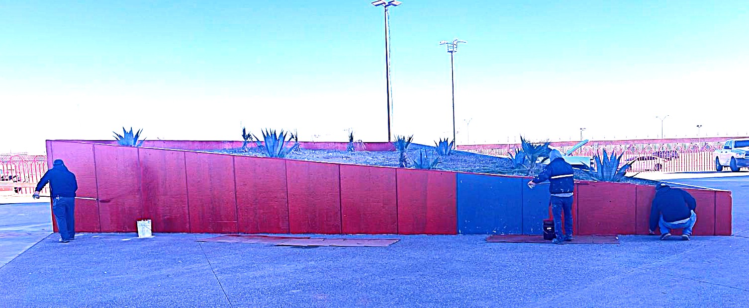 CD. JUAREZ, CHIH.- Las cuadrillas de la Dirección de Limpia llevan a cabo trabajos de pintura en la Plaza de la Mexicanidad, como parte de las labores de limpieza que se realizan de manera permanente en ese espacio.