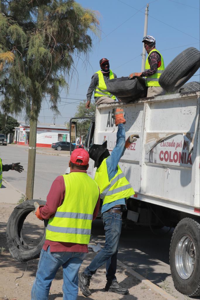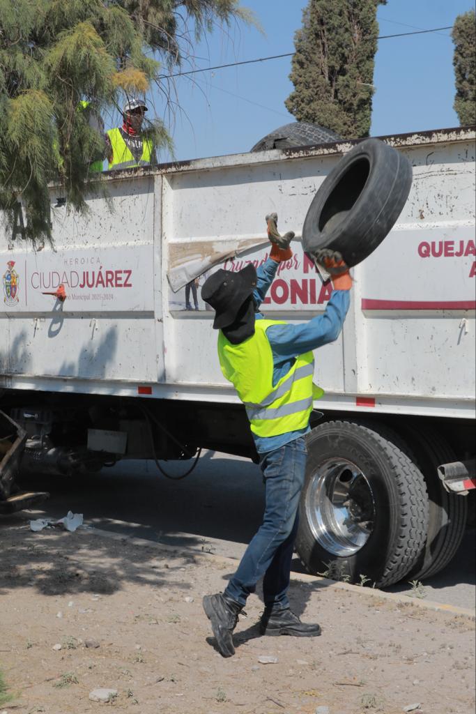 CD. JUAREZ, CHIH.- En apoyo a la Dirección de Salud Municipal con el programa de prevención de la Rickettsia, trabajadores de la Dirección de Limpia recogieron 4.4 toneladas de tiliches en las etapas I y II del fraccionamiento Riberas del Bravo.