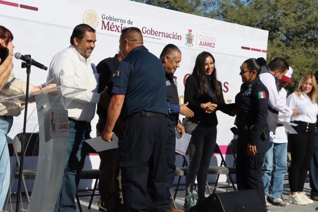CD. JUAREZ, CHIH.- Elementos de la Secretaría de Seguridad Pública Municipal fueron reconocidos por el presidente municipal Cruz Pérez Cuéllar, durante la Cruzada realizada en el fraccionamiento Rinconada Las Torres.