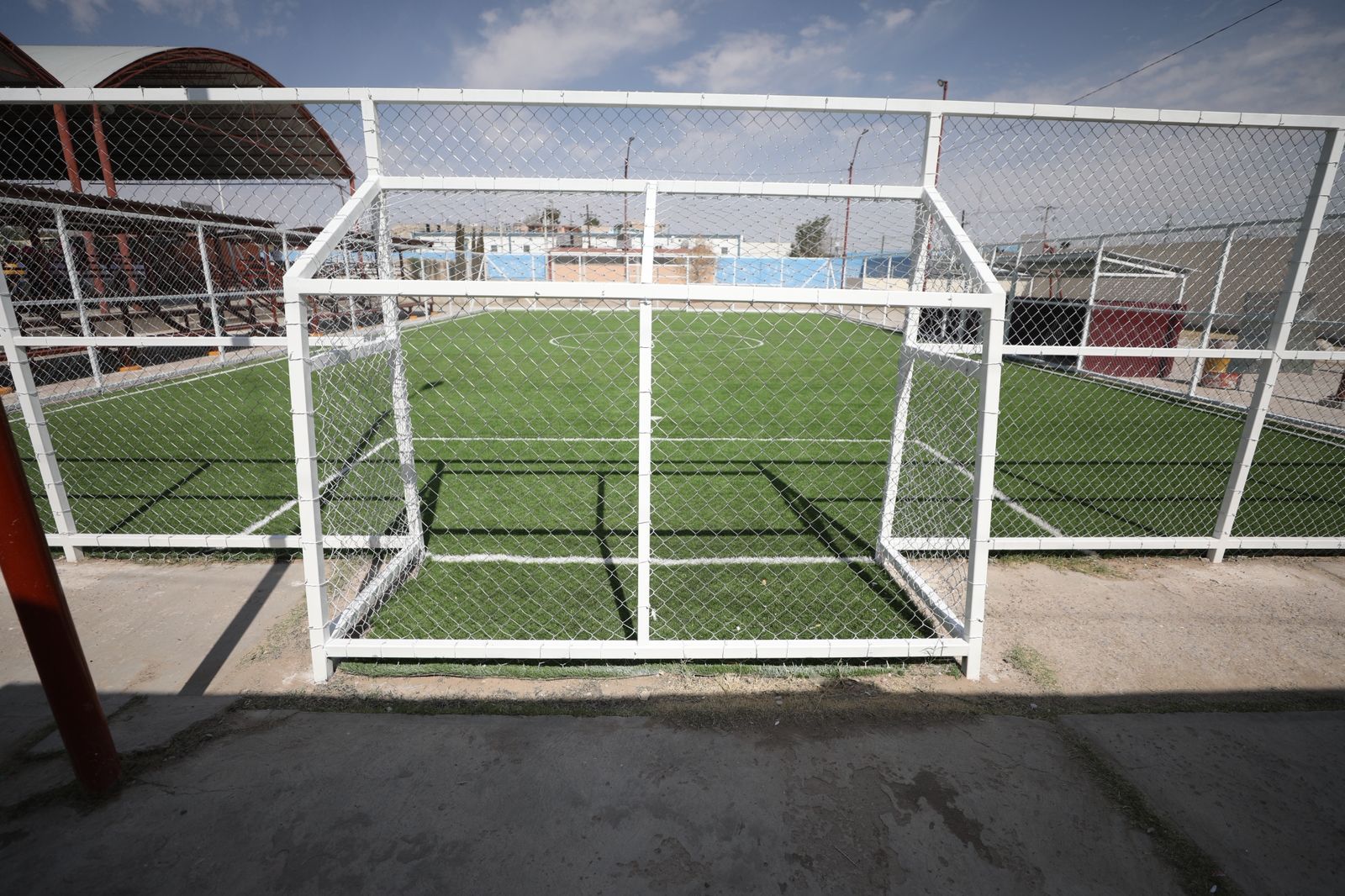 • Construcción de una cancha de fútbol de 28 x 17 metros, con pasto sintético, casetas, estructura metálica perimetral con malla ciclónica y porterías.