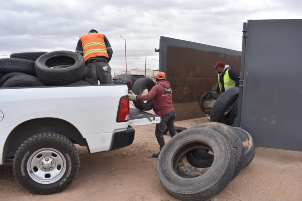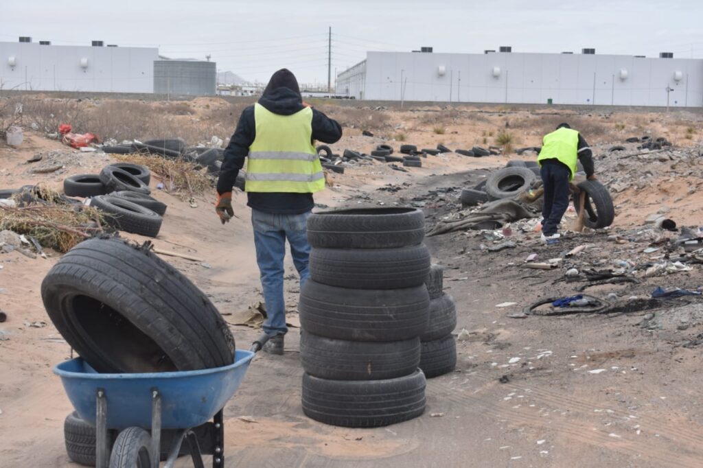 CD. JUAREZ, CHIH.- En un operativo en conjunto con la Dirección de Regulación Comercial, cuadrillas de la Dirección de Limpia retiraron una gran cantidad de llantas en desuso que se encontraban esparcidas sobre un predio baldío, ubicado sobre el bulevar Manuel Talamás Camandari y Mesa Central.