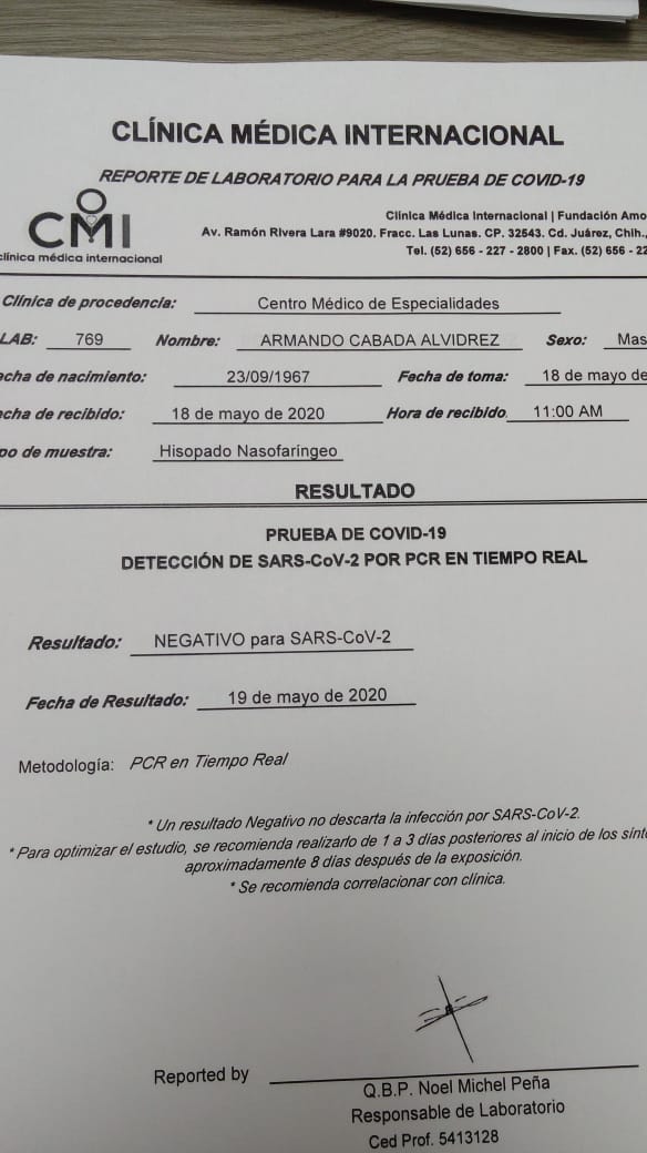 El Presidente Municipal Armando Cabada Alvídrez informó la tarde del martes que el resultado de la segunda prueba de COVID-19 con la metodología de PCR en tiempo real, la cual resultó negativa por lo que se reincorporó a su trabajo en el Despacho.