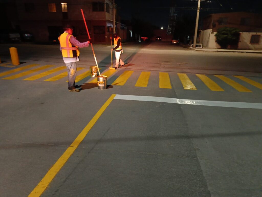 CD. JUAREZ, CHIH.-La Coordinación General de Seguridad Vial, a través del área de Control de Tráfico, llevó a cabo jornadas laborales nocturnas para el mantenimiento y mejora de la señalización horizontal en varias vialidades, con el objetivo de reforzar la seguridad de peatones y automovilistas.