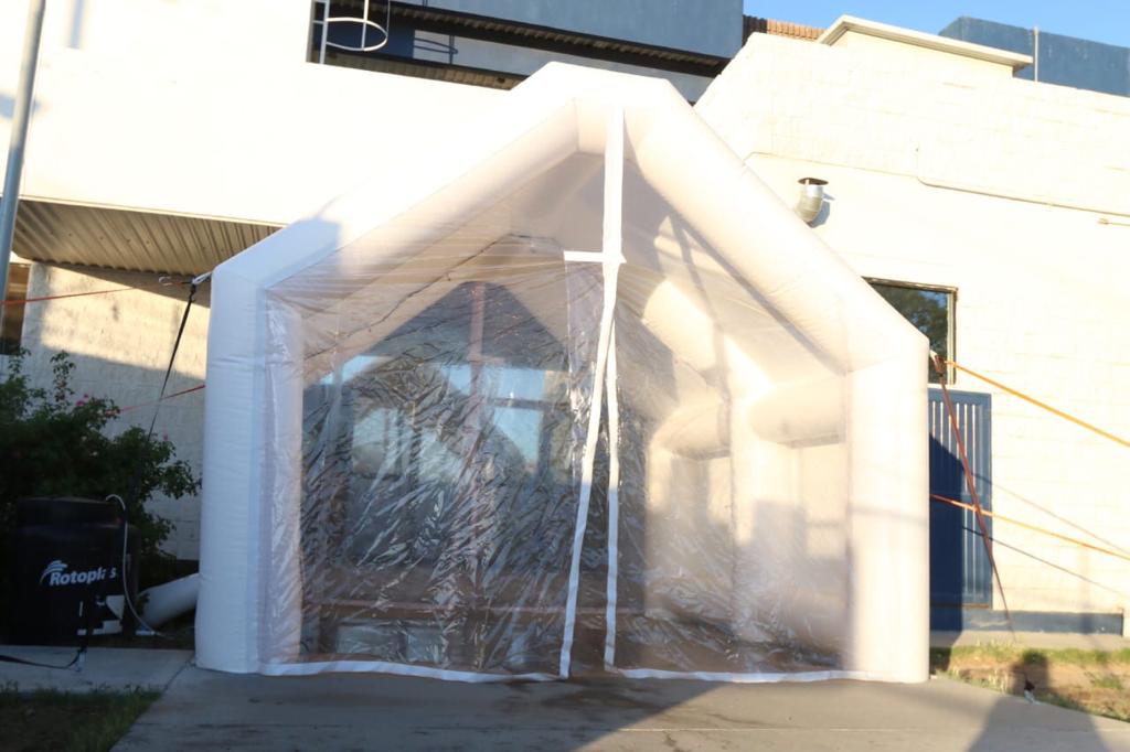 Este túnel inflable es un sistema de desinfectante para personas que disminuye la carga de microorganismos (Hongos, virus, y bacterias de piel, ropa y de calzado).