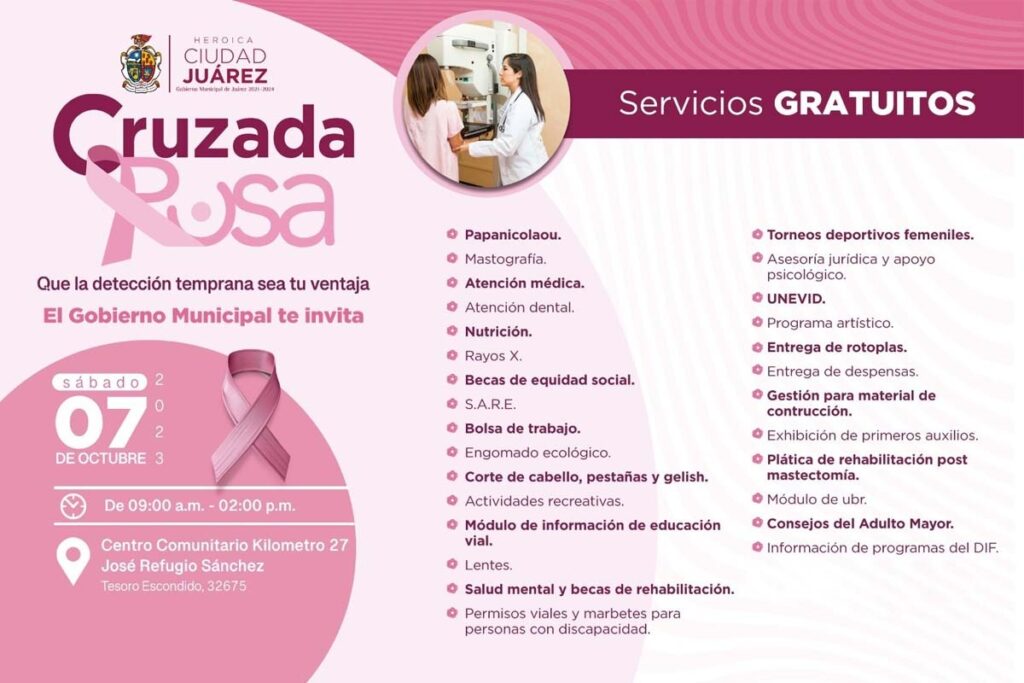 CD. JUAREZ, CHIH.- El Gobierno Municipal, a través de sus diversas dependencias, se encuentra listo para la Cruzada Rosa que se realizará este sábado en el Centro Comunitario José Refugio Sánchez, que se encuentra en el kilómetro 27 de la carretera a Casas Grandes.