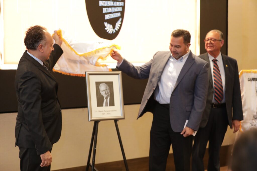 Durante el evento se efectuó la entrega de las constancias de ingreso al recinto, así como la develación de las imágenes de los juarenses distinguidos: Filiberto Terrazas Sánchez y Felipe Talavera García.