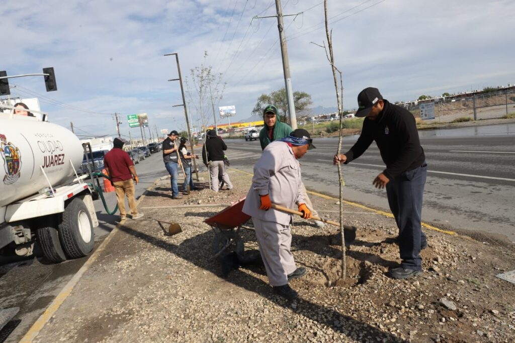 CD. JUAREZ, CHIH.- La Dirección de Parques y Jardines llevó a cabo la plantación de 45 árboles más en el camellón de la avenida Ejército Nacional, en el tramo comprendido entre Rancho Mesteñas y Paseo de la Victoria, con la finalidad de fortalecer las áreas verdes y embellecer la imagen urbana, con estas acciones suman ya 345 árboles plantados en dicho sector de la ciudad.